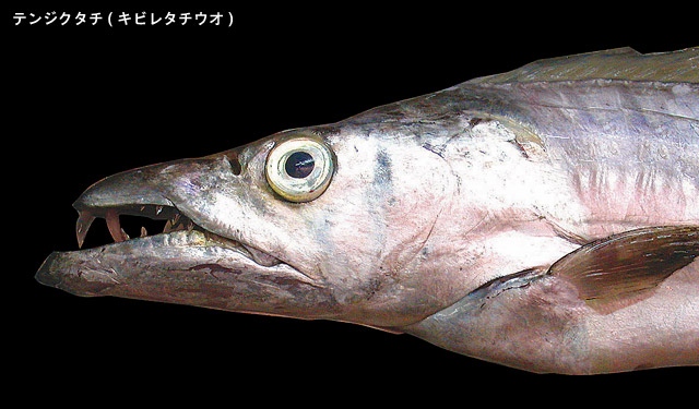 日本近海に分布する14種類の中に、釣りの対象魚であるタチウオ属が3種類含まれています。おなじみの本タチウオと見た目がそっくりで背ビレが黄緑色がかっているテンジクタチは外洋性で、近畿以西の太平洋側で見られます。宮崎県ではキビレと呼ばれ、最大 2m 近くまで成長する人気魚です。