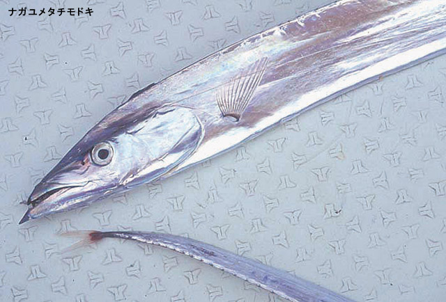オキナワオオタチは沖縄から奄美大島にかけて分布しています。一般的にタチウオの垂直分布は水深 200m までですが、オキナワオオタチは水深 350~400m の砂泥地に潜んでいます。タチウオと比べるとやや体高が低く、鼻梁と上クチバシの間に段があります。これも 2m 以上に成長する大型種です。