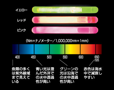 植物プランクトンが多い内湾での透過性が高い光です。沿岸には黄~緑色に発光する生物が見受けられます。たとえばマツカサウオが照明に利用するのは黄色の光。産卵期のイカがメスを誘引するのも黄緑色の光です。イカを捕食する太刀魚の眼に、ケミホタルの色はなじみ深いのかもしれません。この発光色には太刀魚だけでなく、多くの魚種で集魚効果が認められます。