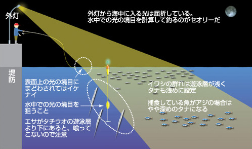 灯りがある波止場が有利ですが、まったく灯りのない場所でも釣れます。エサとなる小魚さえ大量にいれば、そのエサ場から離れないからです。暗い状態でも捕食しているので、このとき ケミホタル があるのとないのとでは釣果が5倍以上も違います。また、夜明け前はこれからエサの少ない深場に移動する前の腹ごしらえの時間なので、短い時間ですが釣果が期待できます。