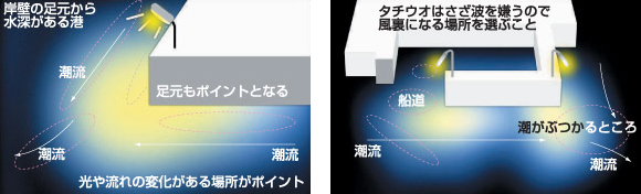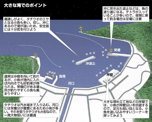 小魚を狙うタチウオが身を隠すためには 4m 以上の水深が必要なので、大きな湾の中の潮通しがよい防波堤は絶好のポイントになります。