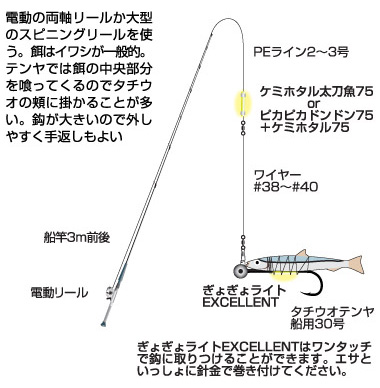 タチウオ用のテンヤ仕掛けに、生きたドジョウなどの餌を針金で巻き付けて海中を引きながら釣ります。ルアーではなく、活きたエサを動かしてアピールするのでヒット率が高くなります。ウキを使わないのでタナ合わせの面倒がなく、テンポのいい釣りができるのが特徴です。