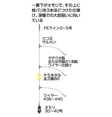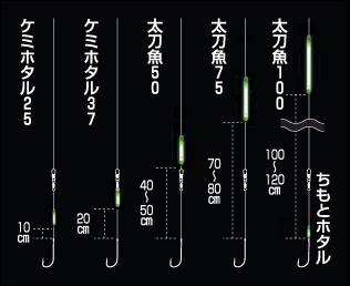 タチウオがまだ遠くにいるときには、視認性の高い大きな ケミホタル を使いますが、すぐ近くまで寄ってきたときに、折ったばかりの明るい ケミホタル だと警戒されることがあります。そのときは仕掛けの上の方まで移動して、エサの近くには ケミホタル25ミニ や、からまんホタル などの小さな光を取り付けてください。 ( 下図の取り付け位置はおおよその目安です。海面の明るさや ケミホタル の明るさ、海水の透明度によって調整してください。 )