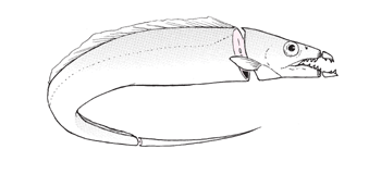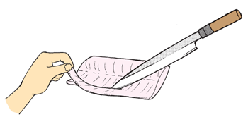 ![]() ① タチウオは背骨が鋭く硬く、小骨も多いので料理には注意が必要です。とくに先端の尖った歯がキケンなので、最初に口先を切り落としてください。つぎにアタマのつけ根から胸ビレの後ろにかけて斜めに切ります。尻尾は刺身になりませんから、煮るなり焼くなりお好きにどうぞ。 |