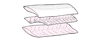 ![]() ② 筒切りにしたら、小骨の多い背ビレをとりましょう。片面づつ2回、ヒレのつけ根からV型に包丁を入れてヒレを引っ張ります。または、背ビレに沿わせるように平行に深く包丁を入れてもOKです。腹側のワタから後の部分にもヒレ骨がありますので、包丁を入れてください。 |