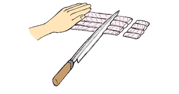 ![]() ⑥ 5cm くらいに切って盛りつければ糸造りの完成。これをさらに細かくきざんで、たっぷりの薬味 ( ネギ・ショウガ・大葉 ) を加えれば香味満点のタタキに大変身! |