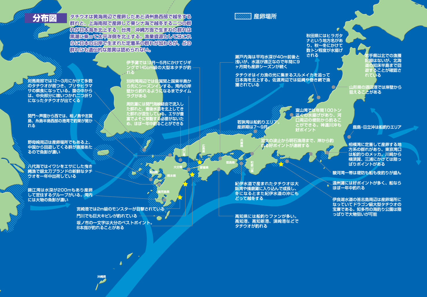 台湾・沖縄方面から回遊してくるタチウオは、九州各地の港湾に入り込む群れと、南北を通過していく群れに分かれる。九州南部を通る群れはまた、豊後水道経由で瀬戸内海に入る群れと、四国沖へ向かう群れに分かれる。九州はこの台湾・沖縄からのルートと、中国沿岸からやってきて対馬海峡経由で日本海へ抜けるルートに囲まれている。