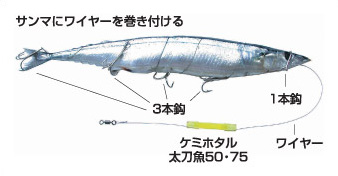 やや沖目の大物を狙う釣法で、サンマ1本まるごとグルグル巻きにして放り込みます。3~4号の磯竿に中型スピニングリール、4~8号の道糸に全長 90cm ほどのワイヤー仕掛けを取り付けてください。一番上の1本鈎は目に刺し通して、4本のトレブルフックを引っかけていきます。タイトに巻きつけておかないと、下半身はだんだん細くなるので緩んでしまいます。