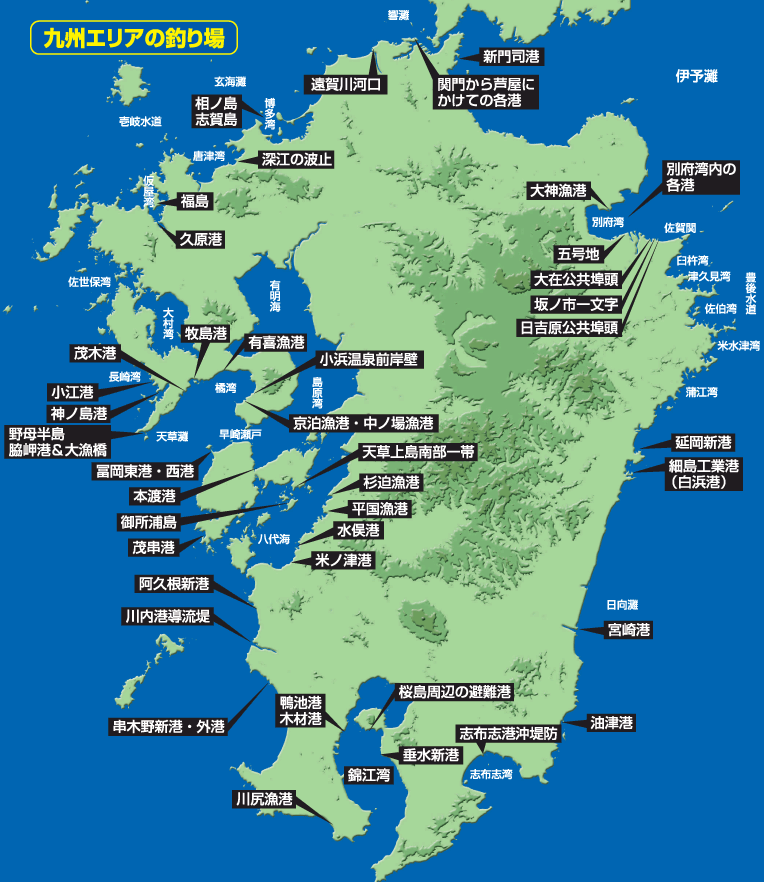 タチウオ釣りが一般的でない仮屋湾や佐伯湾でも稚魚が確認されており、外灯があって充分な水深がある港湾なら釣れる可能性がある。釣れるのはお馴染みの本タチウオ ( 銀タチ・黒タチ ) だが、宮崎港では巨大なキビレタチウオが釣れることがある。14cm のルアーを一発で飲み込むモンスターだが、脂肪量が20%もあってトロ身の味は絶品である。