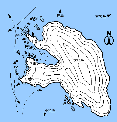 1番は下げでチヌの好ポイントがねらえる。沖目もよいが下げがワンドの中へ回りこむのでそれもねらいめ。竿1本半のタナで釣る。2番からもワンドの中がよい。沖目は足元からオーソドックスに流す。3番は前方から右へ流れる下げ潮を釣る。左側の下げ潮分岐流を攻める場合はウキ下を弱にする。