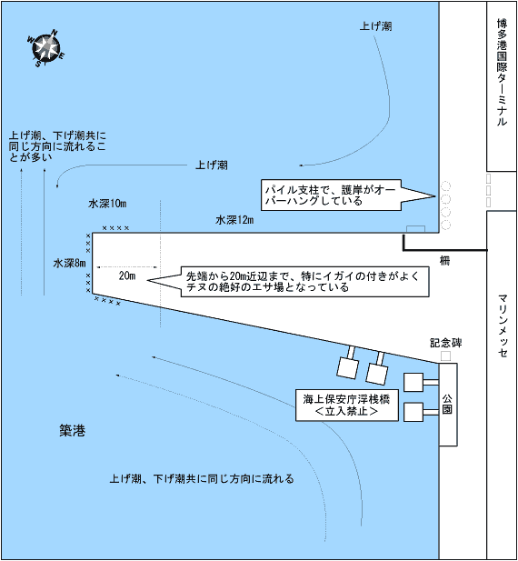 マリンメッセ埠頭は、フラット護岸で底は前方5m以上まで捨て石が入っている。潮通しがいいので、底付近だけではなく、中層でもチヌが食ってくることがある。