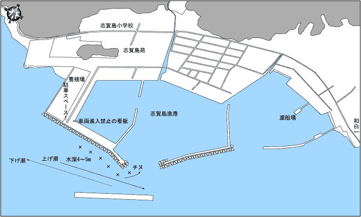ツケエはオキアミでよいが、夏場はバリ(30cm級)が多いのでツケエに工夫が必要。漁港が志賀島の南側に面しているので、北寄りの風に強い。