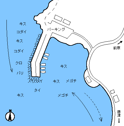 周辺は砂地のため、夏場の投げ釣りのキスがいい。先端のテトラまわりではメイタやバリも釣れる。尚この奥の歩いて行ける地磯では、メイタやクロも釣れる。濁りのある日はチヌも釣れるので、シケ後などがねらいめ。
