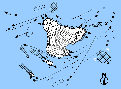 かつてはイシダイ、アラも釣れたと聞く釣場で、ヒラマサ、ヤズなどがブームを呼んだ時期もあった有名な磯である。A点は下げ潮のポイント。右、左の沈み瀬をかわしながら釣る事が重要で、タナは竿1本半〜2本。B点は上げ潮のポイント。足元からの左流れを釣る。C点は両潮やれるが、右手のハナレの間を通す狭い水道でチヌがあたる。ハナレD点は下げに分がある。E点はよほど凪の日にしか上がれない。一般的に乗っ込みチヌ、梅雨グロ、夏のバリがここの本命ねらいであろう。