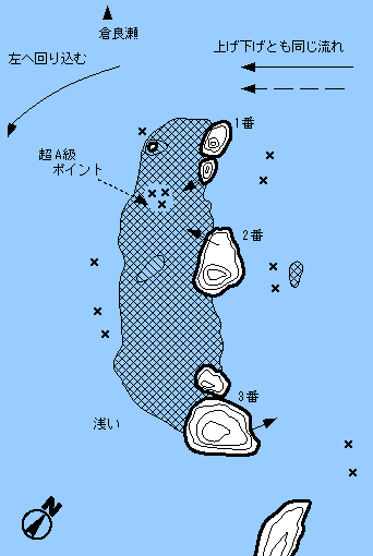 一番北西に面し波の浸食を常に受けているため、この周囲には沈み瀬やハナレ瀬が点在している。1番は西側の沈み瀬のなかの海溝がチヌのA級ポイント。2番からも同じ方向をねらう。3番は水深がいよいよ浅く乗っ込み期以外は期待薄。全体に水深がなく、しかもウネリが激しい場所なので、波のある日は上礁不可能である。小潮まわりが釣りやすい。