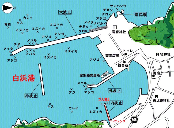 神湊港から定期船に乗れば25分ほどで白浜港に着く。メインの釣り場となる大波止は港の西側に伸びている巨大な防波堤である。ケーソンが高く、登り降りに難儀するものの上がってしまえば意外と足場は良い。ただし、海面からは高いので長い玉網が必要となる。フカセ釣りでクロ、チヌ、メイタ、メバル、シーズンになれば青物の回遊もみられる。投げ釣りは定番のキス、カレイが中心。ミズイカも多いところである。