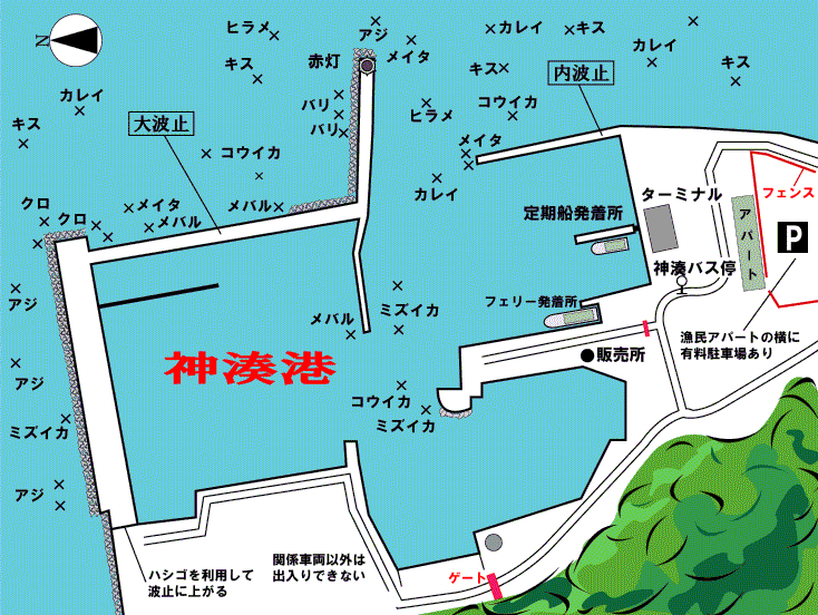 宗像大島や地島に渡る定期船のターミナルがあり、有料駐車場、トイレ、売店が完備されている。港内を囲むように伸びている内波止と大波止がメインの釣り場である。とくに定期船の桟橋に並行している内波止は足場が良く、テトラポットも投入されていないのでファミリーフィッシングには最適のところだ。フカセ釣りでメイタやメバル。投げ釣りでカレイやキス。サビキ釣りではアジゴ、コノシロ、ボラがヒットする。コウイカ、ミズイカも多く、エギングも楽しめるところだ。