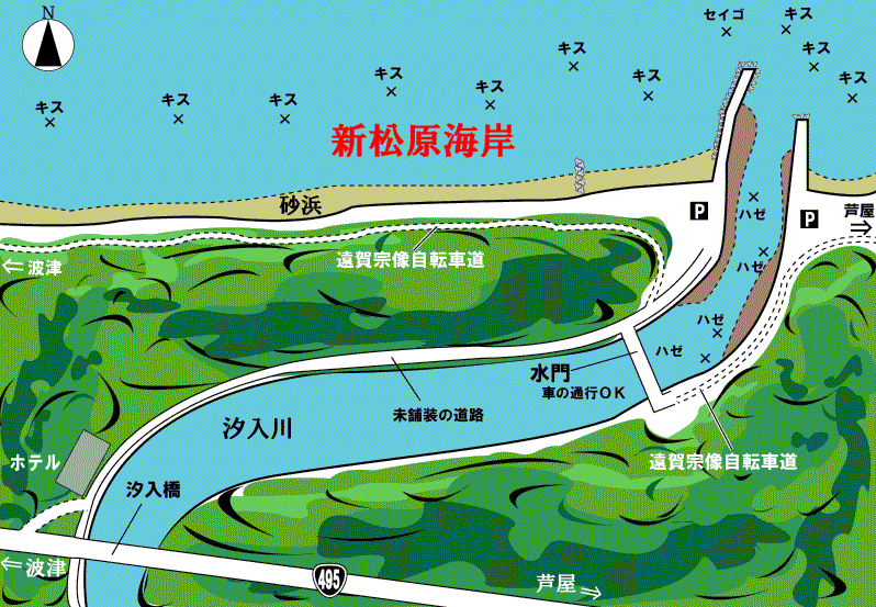 芦屋と波津の間は長い砂浜が続き、三里松原と呼ばれている。三里も続いている砂浜はキス釣りのスポットとして投げ釣りには最適の釣り場となっている。車でそばまで行ける汐入川の河口は松原海岸の中でも特に人気の高いところ。河口付近ではハゼ、砂浜に伸びたテトラ周辺ではセイゴやスズキが狙える。