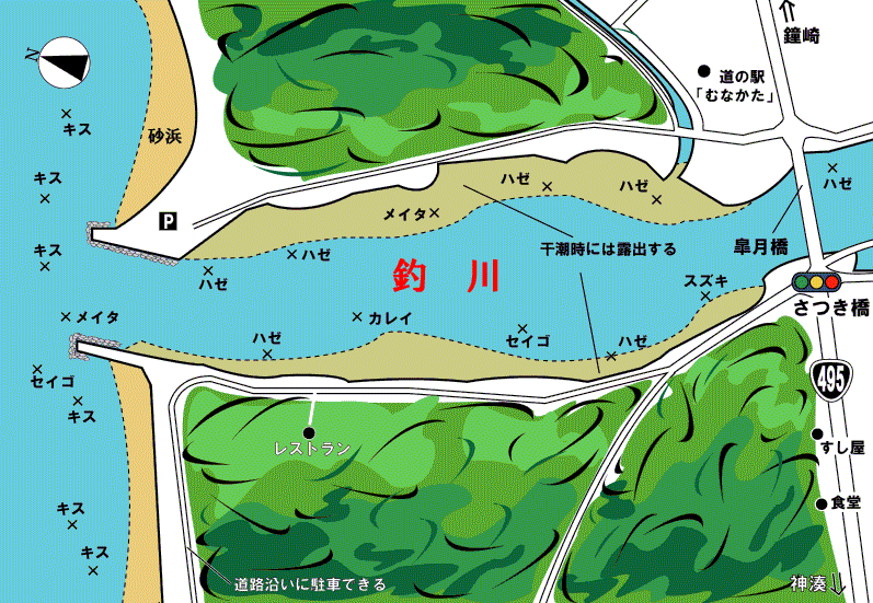 釣川の皐月橋は宗像市の海岸線を走る国道495号線の県道69号と県道300号に囲まれた中間部に位置する。すぐそばに道の駅「むなかた」があるのでそこを目印にすればわかりやすい。釣川の両サイドには海岸につながる道があり、河口付近には車の停め置きも可能だ。皐月橋周辺は交通量も多いところで、駐車スペースも極めて少ない。河口周辺に車を置いて、釣り場へは徒歩で移動するようにしよう。