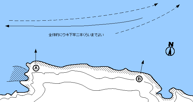 タナでよく、10号程度のカゴでよい。秋から青物がよく、イサキ、クロも狙える。
