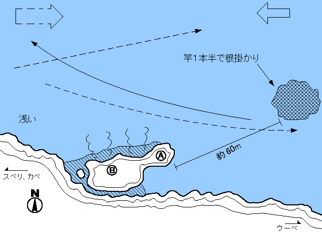 仕掛けで十分である。秋から青物、冬季はクロもよい。B点はサラシがあればフカセ