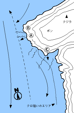 沖ノ島のほぼ最西端に位置し、潮切れもよいが、Aより上げ潮を竿3本のタナで思い切って遠くまで流してマダイがよい。下げ潮は先端をかすめてクジラ方面へ流れるが、足場が悪いため先端にでにくいため、釣り辛い。B点へ移動する人もいるが健脚向き。昼釣りではA及びC点での足下でのクロのフカセ釣りがよい。