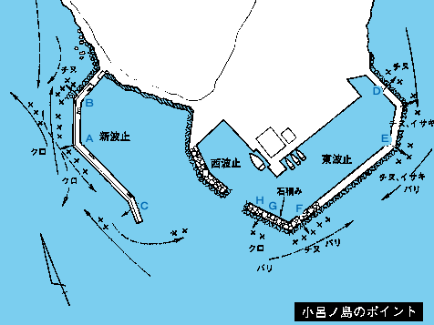 【 東波止 】 通称テトラの名のとおり、全体にテトラが入り、足場がよくないのでベテラン向きだ。しかしながらときには3キロを越すチヌがでるので、ここに通うフカセ釣りファンは多い。地かたのDはニゴリがでると、大型チヌがヒットする。Eも竿1本のタナでチヌ。ほかにクロ、夜釣りのイサキ。Fも大型チヌの実績があり、中型のクロも多い。G,Hはクロ、バリが多い。西波止は新波止ができてから潮行きが変わり、ぱっとしなくなった。小呂全体に言えることだが、根魚の魚影がすこぶる濃いところなので、アラカブやメバルなどを専門にねらってみるのもおもしろい。季節にはイカも釣れるのでおみやげには事欠かない。 |