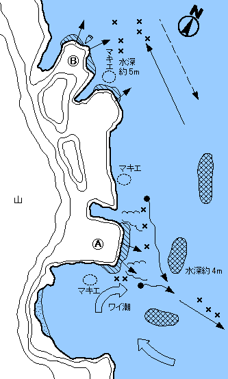 大島のポイントはほとんどが北向きで、冬場のシケには極端に弱いが、この時に威力を見せるのがこの瀬である。全体にまわりこんできたサラシが一面を白くするような日ほどよく釣れる。Aは水深も3ヒロほどしかないが、こういう日はチヌの数釣りもできるほどA級釣場に変身する。Bは竿1本の深さがあり、型をのぞまなければ、クロがおもしろいように釣れる。全体で収容力もあり、家族向けには最適で、ピクニックを兼ねた釣りや磯釣り初心者のトレーニングに向いている。