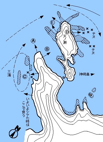 三浦のA,Bはチヌ、クロの多いところである。冬場のサラシがきつい時はCからがよい。ワンドから出るサラシに仕掛けを乗せるとチヌなどの数釣りも可能だ。サラシでルアーを引くと大型のスズキもあたる。