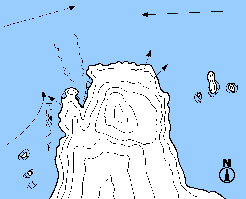 足元から竿1本半以上の水深があり、クロの数釣りができる。左手には海溝があり、イシダイもでる。マキエとツケエを同調させるオーソドックスな釣りでよい。深くさぐるとチヌも姿をあらわす。但し大島の特に北西向きの地磯は波がふくれ上がる危険性があり、過去犠牲者も多く、近場だからと油断は禁物である。