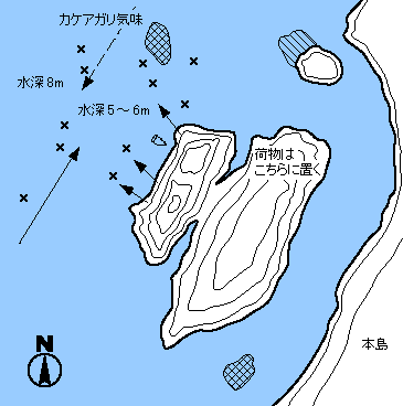 乗っ込みチヌがよい。竿1本強のタナで沖へ払い出す潮をねらう。全体に掛け上がりで浅く、乗っ込みチヌ以外は期待薄。ポイントは瀬のすぐ前で三人はやれる。