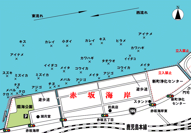 国道199号線、小倉北区・赤坂海岸交差点から海側に曲がり、臨海公園の駐車場に車を止め、グランドの横を通ると徒歩2〜3分で遊歩道にでる。遊歩道の端から端までは約700メートルあり、どこでも竿出しができる。199号線の赤坂海岸付近交差点のどこからでも遊歩道には出られるが、駐車できるスペースが限られているので、臨海公園内から抜けた方が賢明だ。