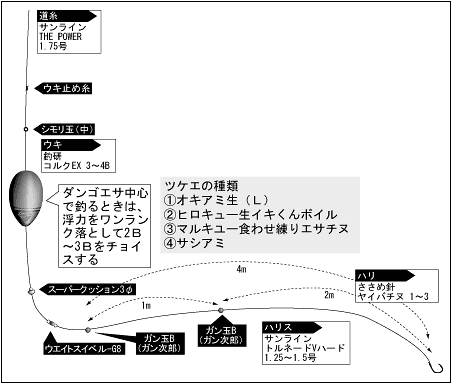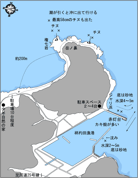 岳ノ鼻は春先が良く、4月は特に良い。漁港出口の波止では、下げ3分〜7分が良く、一番下のテトラが見える時が時合いとなる。手前の波止は中間ほどの外側、サオ1本先に沈み瀬がありポイントとなる。地磯も全体的に遠浅だが、沈み瀬を中心に攻めれば大型のチヌが釣れる。また、漁港側では秋口にスズキクラスもヒットする。
