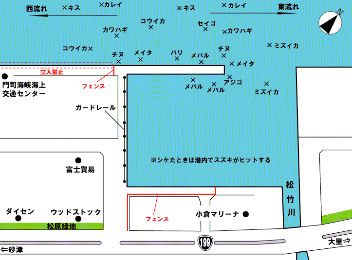 釣人の間では小倉マリーナ裏といった呼び方が一般的だ。国道3号線に接続している連絡道路橋の下から、門司海峡海上交通センター付近にいたるこの海域は良型チヌの多いところ。ただし、周辺にはフェンスが張り巡らされているので、ここしか竿出しできるところはない。ほぼ周年、フカセ釣りでチヌやメイタが狙える。夏場のエサ盗りの多い時期は虫エサを使っての半夜釣りも効果的だ。