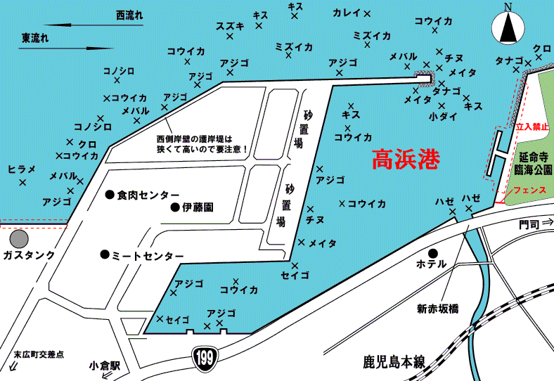 国道199号線、小倉北区の末広町交差点から海側に抜けると食肉センターの前にでる。この付近一帯が西側岸壁だ。センターの突き当たりを右に進むと高浜港内の砂置き場前にでる。ここから左側に進めば防波堤だ。車は付け根付近に数台を止めることができる。西側岸壁にはここから犬走りを歩いても行くことができる。