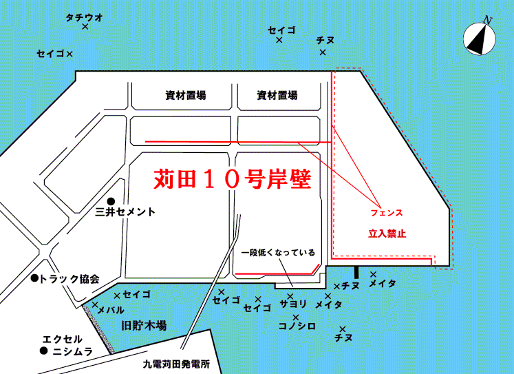 10号岸壁埋立地の先端部分にはフェンスが張ってあり、立ち入ることはできない。竿出しは東側一帯の旧貯木場周辺がメインとなる。チヌ、メイタ、セイゴ、コノシロ、メバルが狙える。周辺の道路に車を止めることができるのでとても便利だ。