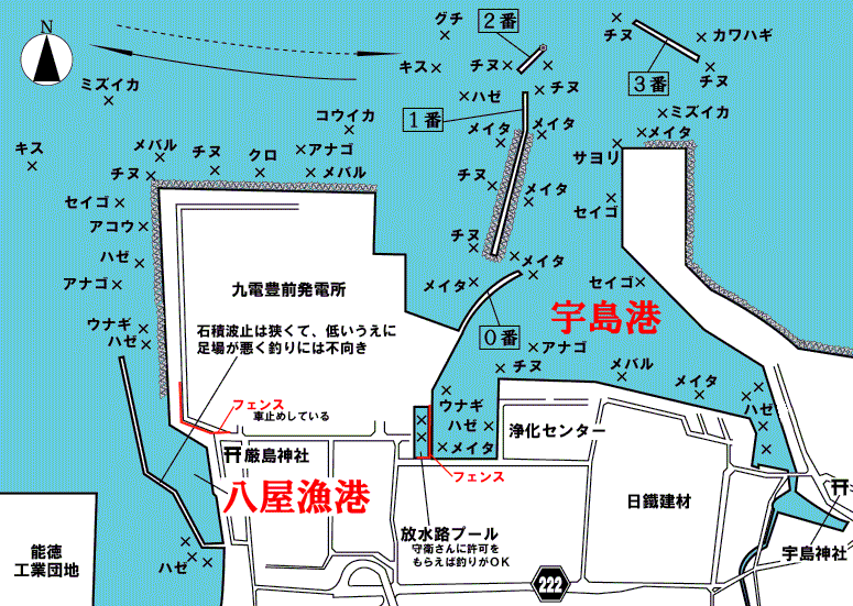 港内では全体的に沖がシケ気味のときにチヌの食いが立つ。港内最奥部に位置する発電所内の遊水池で釣りをする場合は入口の守衛所で申し込みをすればOKだ。ただしマキエとボラ掛けは禁止になっている。 |