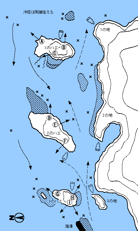 @のハエAは15m先、竿2本半〜3本でチヌ。Bも沖目の沈み左側Cは足元のサラシからねらう。AのハエはDで張り出したタナの際を竿1本半で。Eは水道の深みを竿2本以上のタナで釣る。チヌが多い。Fは下げ潮が沖に出るところをねらう。BのハエGは目の前の沈みの沖がポイント。タナ竿2本半〜3本と深い。取りこみはAのハエの方に誘わないとバラシが多い。Hは水道側でややシケ気味の日はチヌの大釣りができる。Iは沈みの際を釣る。