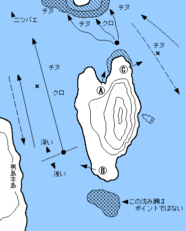 Aは前方約20m先にある大きな沈み瀬に向かって釣る。チヌ、クロとも釣れる。Bは男島との水道を釣る。上げ潮のみの釣り場といってよい。Cは逆に下げ潮の釣場で沖目を探ると大型のチヌが釣れる。エサ盗りが多いので、マキエワークに注意が必要。
