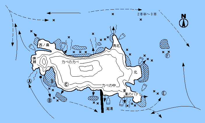男島北側の独立礁でハンドとも呼ばれている。真北は両潮やれるが下げ潮の払い出しが足元から伸びるので竿1本半程のタナでチヌが釣れる。左側ワンドの沈み周辺でもチヌがあたる。カベのカベは前方の長い周辺をねらうとチヌが出る。また、払い出しもよいポイントでここはやや遠めでチヌがあたる。横瀬はAの払い出しでチヌ。下げ潮で数釣りも可能。手前のタナの先Bではクロもよい。キロオーバーも時々でる。このC、B、Dの周辺はクロが多いところだ。東は足元、東のハナレも下げ潮がまわりこんでEに向かうときにチヌが釣れる。竿2〜3本と深めにとる。