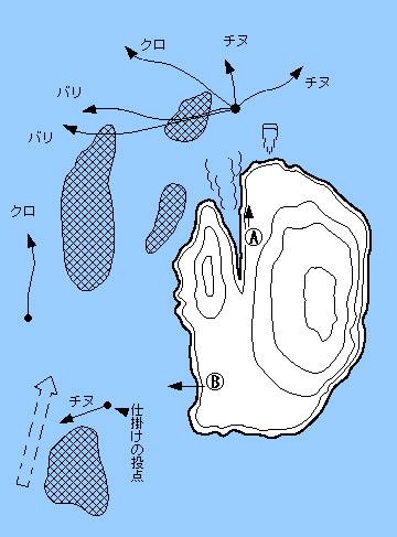 すべて下げのポイントといってよい。Aは横のワレからマキエを入れ、正面に仕掛けを運ばせる。浅いので磯際にたつと釣れないのでAのところに立つこと。2ヒロで十分。Bは前方沈み瀬周辺をねらう。全体にチヌ、クロとも2ヒロ。夏の夜釣りではマダイ、チヌもねらえる。