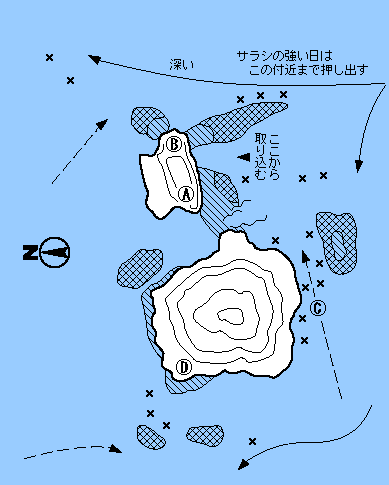 ハナレはAで前方にできるサラシをねらう。竿1本強でチヌ。Bは右側に伸びる沈みの際をねらう。深いので竿2〜3本のタナをとる。CはローソクのA級ポイント。下げ潮が動き出すと居付きのチヌが穴から出てきてエサをあさる。竿1本半。Dは両潮やれ、5m先の沈み周辺を竿1本前後でねらう。