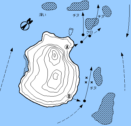 A、Bとも下げ潮のみの片瀬ポイント。Aは前方に沈みが多いところ。クロは2ヒロ、チヌは竿1本でこの周辺を狙う。Bはウキ下1本強のタナで前方沈みとの間の水道から左手の沈みをめがけて流す。チヌがよく釣れる。