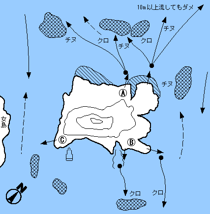 Aは下げ潮を前方の沈みに流してチヌ、クロ。クロは2ヒロ、チヌは竿1本半。Bは足元のくれこみからマキエを打ち、沖へ流すとクロが数釣れる。Cは潮裏だが、メバルが多い。