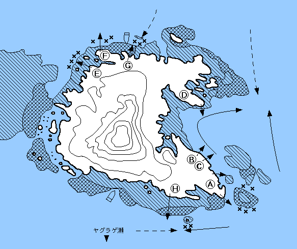 Aは沈み瀬だらけなので仕掛けを沖に投げて前にひいてきて、沈みの間で止め釣りをする。タナは1.5ヒロ。B、Cはワンドの中を左からカーブする潮にのせてチヌがでる。Dは左沖へ出る潮に仕掛けを入れる。E、F、Gは沈み瀬の周辺で型のよいチヌが釣れるところ。全体にクロも多く、足の裏までのクロが数釣りできる日もある。