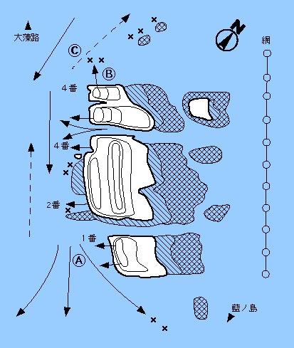 @番はAに仕掛けを入れ関門西流れの時は左になるのでときどき止め釣りするとチヌがでる。A番はこの瀬の本命。周囲のマキエは左前方の沈み瀬でまく。チヌ、クロ共よい。B番は左手沈みの際でチヌ、クロ。ここは左流れの時がよい。