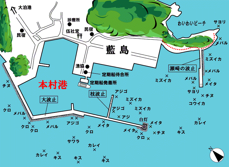本村港の代表的な釣り場は定期船の到着する桟橋の目の前にある大波止。先端部までは15分も歩けば着く。付け根部分から先端部まで竿を出せるところはすべてがポイントになる。フカセ釣りではチヌ、メイタ、クロ、メバル、アジ、タナゴ、サヨリが釣れる。シーズンともなればスズキ、サワラ、カマスなどの回遊もみられるのでジギングも楽しめる。投げ釣りではキス、カレイ、小ダイ。サビキではアジゴ、メバル、小グロなどの小型魚がメインとなる。ミズイカ、コウイカも多く、エギングもいたるところで楽しめる。