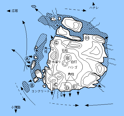 チヌ釣りに関しては北九州でも群を抜く釣場である。Aが一番よいが、足場がないため小潮中心の釣場だ。チヌは2ケタ釣りも可能だが、船が通るたびに波が足元を洗うので、チャランボなどの用意があればよいだろう。Bは足元に大きな沈み瀬があり、沖目狙い。CDEはABに近づけない時のポイントで、ポイントは8m先。タナはニヒロ半程度でいいだろう。FはA同様、低い瀬で注意すること。大型チヌが釣れる。GHはやや沖目で、特にHはクロも釣れる。