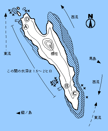 チヌの魚影が非常に濃いところで、特に秋口から4月までの間に上礁できれば大釣りも可能だ。AはA級で前方沈み瀬まわりを1.5ヒロ程のタナでチヌが釣れる。Bは目の前の沈み後方であたるのは、大型のチヌが出るところだ。Cは夜釣りで大チヌが出る。Dは乗っ込み時のポイント。