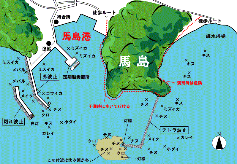定期船の発着している港内はコウイカやミズイカの多いところ。エギングではいたるところからの竿出しが可能だ。フカセ釣りとなれば外波止の先端付近でチヌ、クロ、メイタが狙える。沖側にできた切れ波止のおかげで、海峡の潮流の影響をそれほど受けないようになって釣りやすくなったものの、釣果のほうは以前と比べて目減りしている。先端部はテトラが投入されてなく、ここから内側のヘの字部分までが釣りやすいところ。冬場のチヌ、メイタには定評がある。